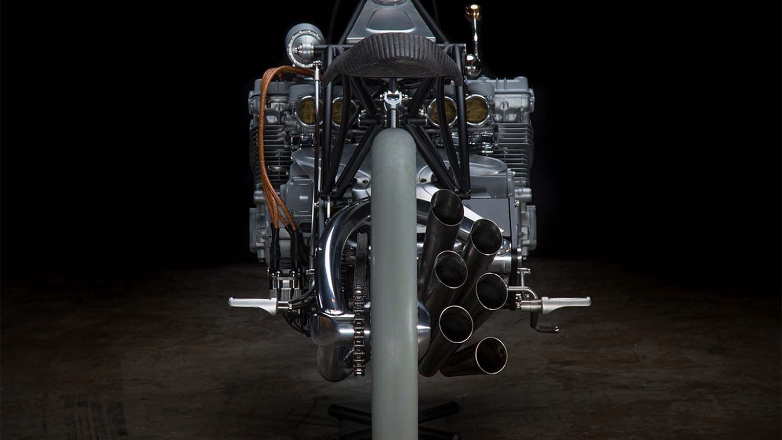 Προσέξτε επίσης τον τρόπο με τον οποίο έχει τοποθετηθεί το μοναδικό φρένο της μοτοσυκλέτας, ο επιλογέας ταχυτήτων, τα καλώδια μπουζί και η εξάτμιση με τις 6 ξεχωριστές απολήξεις!