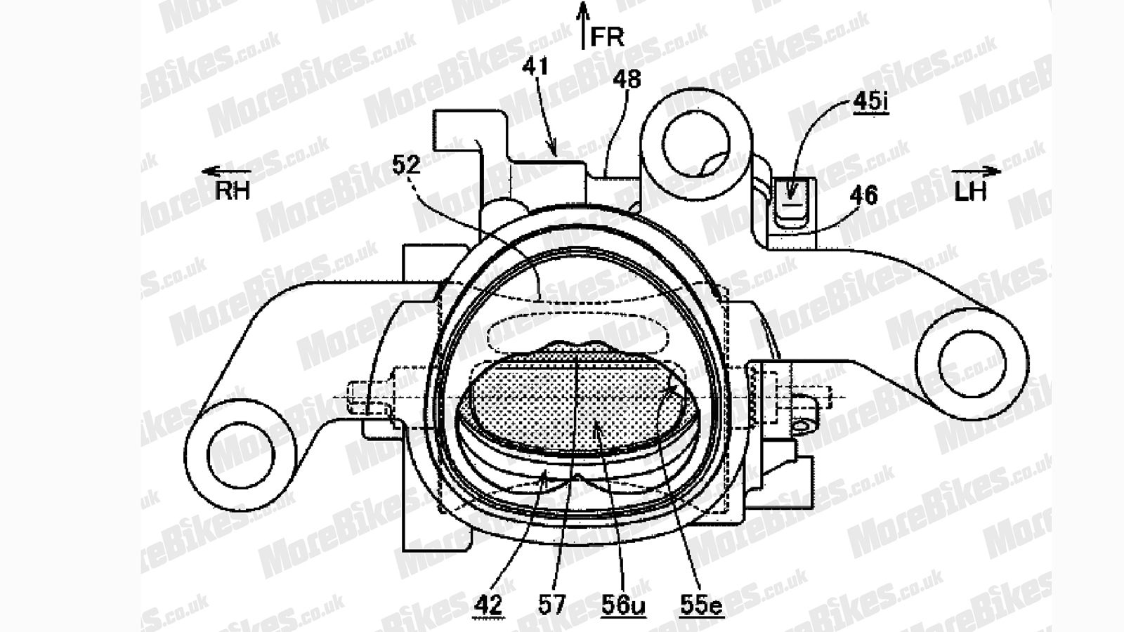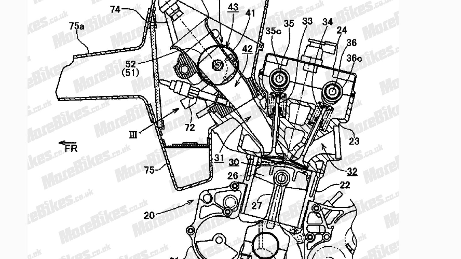 Πέρα από αυτό όμως, βλέπουμε ότι η εταιρεία πατένταρε και ένα νέο σύστημα ελέγχου γκαζιού, με μια περιστροφική βαλβίδα αντί για πεταλούδα, που έχει σκοπό την βελτίωση της ροής του αέρα στον αυλό εισαγωγής. Μάλιστα, αν προσέξει κανείς τα σχέδια, διακρίνονται τα δύο μπεκ καυσίμου, το ένα χαμηλά στην εισαγωγή κοντά στην κεφαλή και το άλλο ψηλά, στην αρχή του αυλού, πράγμα που επιβεβαιώνει ότι μιλάμε για μια μοτοσυκλέτα επιδόσεων.
