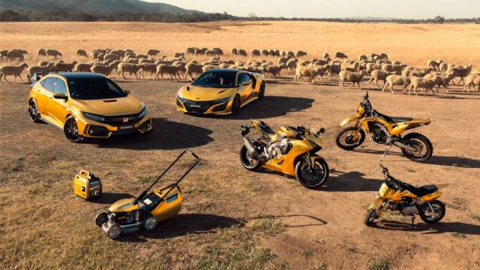 Αλλά η Honda δεν σταμάτησε εκεί και έντυσε στο ίδιο χρυσό wrap, ένα Civic Type-R, ένα NSX, ένα… χορτοκοπτικό και μια ηλεκτρογεννήτρια! Προφανώς η εμπορική παρουσία του σήματος δεν αφορά μόνο την μοτοσυκλέτα. Γιατί να περιοριστεί και ο εορτασμός;