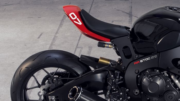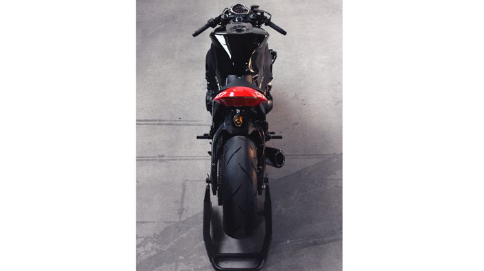 Έβαλαν λοιπόν στο παιχνίδι ένα αμορτισέρ της Ohlins, μια εξάτμιση της Two Brothers, αντικατέστησαν όλες τις σιλικονούχες σωληνώσεις με μαύρες σωλήνες, ομοίως και όλες τις υδραυλικές γραμμές φρένων, έβαψαν σε μαύρο τις τιμονόπλακες, τους λαιμούς των εξατμίσεων και το κάτω μέρος του κάρτερ. Στη συνέχεια προσέθεσαν μαύρα δοχεία υγρών της Rizoma, μαύρο κάλυμμα ψυγείου από την Evotech και ένα ανθρακονημάτινο μπροστινό φτερό. Μάλλον τα τρία χιλιάρικα δεν επαρκούν για να προστεθούν και όλα αυτά.