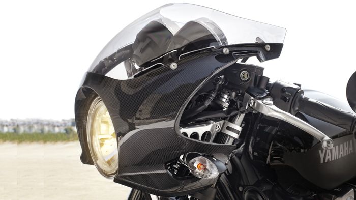 Αντίθετα με το γυμνό XJR 1300, στο Racer έχουμε ένα carbon-fiber(!) café-racer φερινγκάκι, και έχει ιδιαίτερο σχήμα, που δεν ταιριάζει εύκολα στο μάτι, με την υπόλοιπη μοτοσικλέτα (ίσως πάλι να χρειαζόμαστε λίγο ακόμα καιρό για να το χωνέψουμε). Το τιμόνι είναι τύπου κλιπ-ον, ενώ η σέλα του συνεπιβάτη διαθέτει carbon κάλυμμα. Αλλαγμένη είναι και η θέση οδήγησης, με τον αναβάτη να κάθεται περισσότερο σκυφτός.