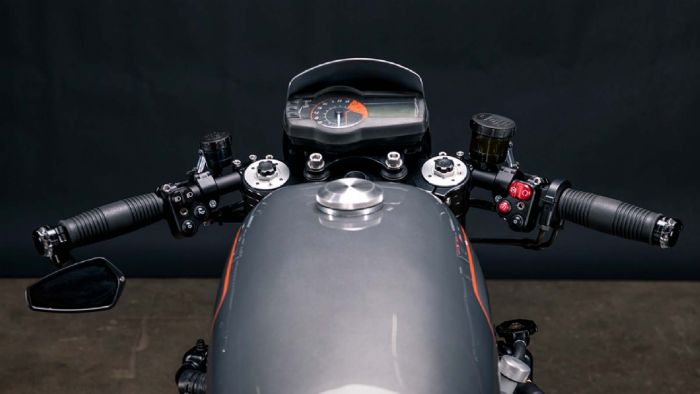 To τιμόνι αντικαταστάθηκε από κλιπόν της Vortex, το οργανάκι άλλαξε θέση, ενώ τα φωτιστικά εμπρός και πίσω είναι LED. Σε περίπτωση που δεν βρίσκετε το πίσω φωτιστικό, είναι τα μικρά LED που διακρίνονται εκατέρωθεν της εξάτμισης… Νέοι είναι και οι εκπληκτικοί διακόπτες της Renard Speed Shop, οι τρόμπες φρένου και συμπλέκτη της Magura, ενώ η βαφή έχει γίνει όλη στο χέρι.