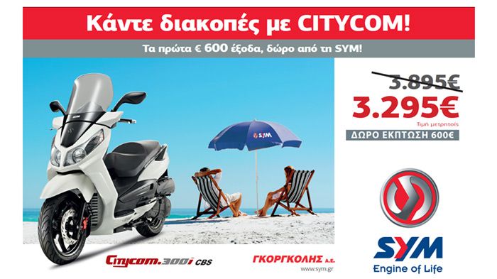 Φέτος το καλοκαίρι, η ΓΚΟΡΓΚΟΛΗΣ Α.Ε, προσφέρει το δημοφιλές 300άρι scooter της SYM σε ακόμη πιο προσιτή τιμή. Επωφεληθείτε και κερδίστε 600 ευρώ έκπτωση στην τιμή μετρητοίς του SYM Citycom 300i CBS.