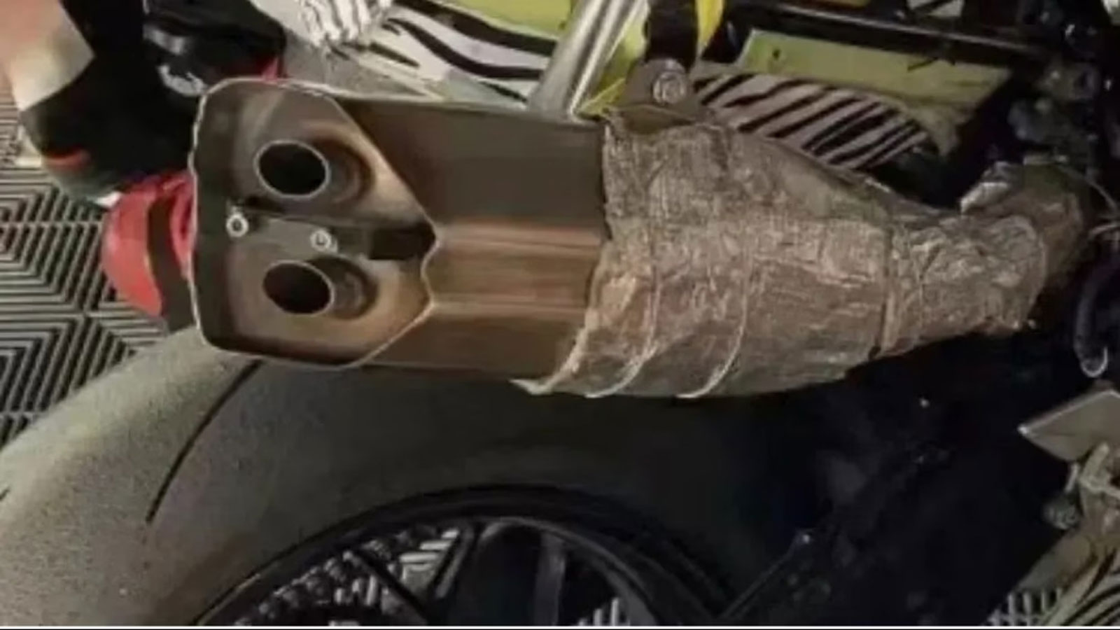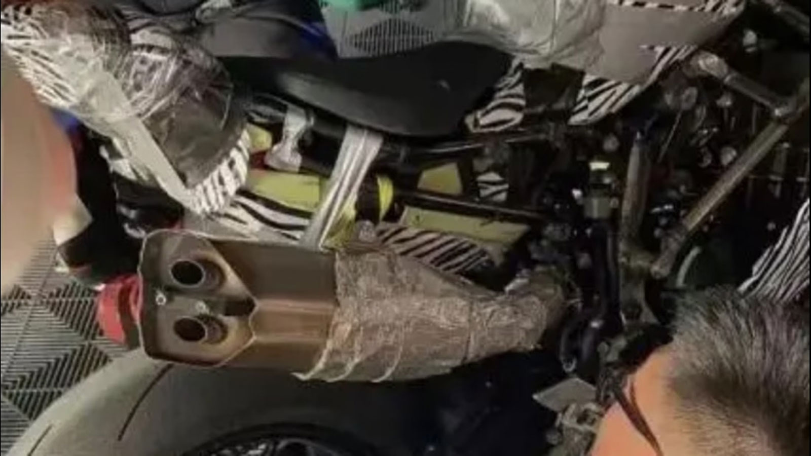 Ενδιαφέρουσα λύση αποτελεί η χρήση κολλητικής ταινίας σε πολλά σημεία της μοτοσυκλέτας όπως φαίνεται από τις 3 φωτογραφίες, αλλά και η όψη των semi-slick ελαστικών, η οποία μας μαρτυρά πως η μοτοσυκλέτα έχει οδηγηθεί στο όριο αφού η φθορά είναι ομοιόμορφη σε όλη την επιφάνειά του. Το γεγονός αυτό μαρτυρά με τη σειρά του πως το πλαίσιο έχει μελετηθεί και κατασκευαστεί σωστά ενώ εμφανές είναι κι ένα ανεστραμμένο πιρούνι USD με δύο δίσκους εμπρός για το φρενάρισμα. Το ψαλίδι φαίνεται να είναι αλουμινένιο έχοντας πρακτικά την ίδια δομή με εκείνο του 800 ΝΚ πιθανότατα με 145 χλστ διαδρομής με την διαδρομή της μπροστινής ανάρτησης να είναι 140 χλστ.