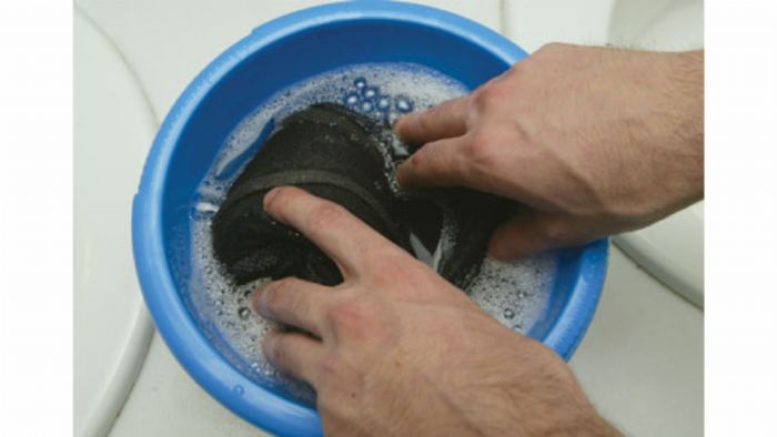 Αρχικά αφαιρούμε προσεκτικά την επένδυση από το κράνος, αφού πρώτα παρατηρήσουμε πώς τοποθετείται και κουμπώνει ξανά, ώστε να μπορούμε να την τοποθετήσουμε αφού τελειώσουμε. Τα σύνεργα καθαρισμού μας είναι λίγα και εύκολο να βρεθούν. Μία λεκάνη με νερό και ένα ουδέτερο σαπούνι (ένα σαπούνι για μωρά μπορεί να αποδειχθεί τέλειο για την περίσταση) μας αρκούν. Σε καμία περίπτωση δεν πρέπει να μας πιάσει… μανία απολύμανσης και να χρησιμοποιήσουμε χημικά ή οινόπνευμα, καθώς έτσι θα καταστραφεί η επένδυση. Το πρώτο βήμα είναι να βάλουμε την επένδυση μέσα στη λεκάνη με το νερό και να την αφήσουμε να μουλιάσει για μερικά λεπτά. Έπειτα, την τρίβουμε απαλά με το σαπούνι (ξεχάστε σκληρό τρίψιμο, σκάφη κτλ.), με ιδιαίτερη προσοχή. Αφού την καθαρίσουμε, την ξεπλένουμε και την αφήνουμε μερικά λεπτά μέσα στο νερό.