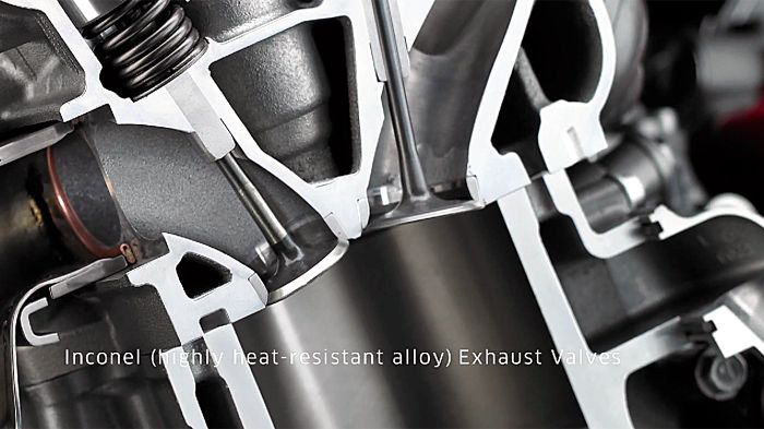Και φτάσαμε στις βαλβίδες εξαγωγής, και στη θερμική τους κατεργασία. Η Kawasaki επέλεξε τη λύση των βαλβίδων εξαγωγής Inconel, οι οποίες κατασκευάζονται από κράμα Nimonic 751. Τα υπέρ-κράματα (superalloys) της οικογένειας Nimonic (σήμα κατατεθέν της Special Metals Corporation) συνήθως αποτελούνται από 50% νικέλιο, 20% χρώμιο, μαζί με πρόσθετα όπως τιτάνιο και αλουμίνιο, ενώ χρησιμοποιούνται κυρίως σε τουρμπίνες αερίων.
