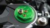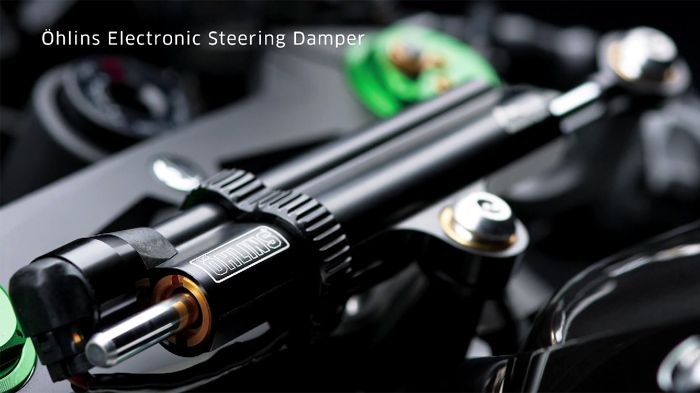 Ο τίτλος λέει "Components of the highest quality". Εξαρτήματα υψίστης ποιότητας. Στο επόμενο πλάνο, βλέπουμε την αγωνιστική ανάρτηση της Kayaba, με την πανέμορφη πράσινη πάνω τάπα στο καλάμι, με το logo ΚΥΒ, από όπου ο αναβάτης ρυθμίζει απόσβεση συμπίεσης, επαναφοράς και προφόρτιση. Περνάμε στο ηλεκτρονικό σταμπιλιζατέρ της Ohlins... ηλεκτρονικό είπαμε; σας θυμίζει κάτι αυτό; α ναι, το HESD (Honda Electronic Steering Damper), που ήταν παγκόσμια πρωτιά όσον αφορά στα ηλεκτρονικά σταμπιλιζατέρ, το 2004. Το HESD δεν τα είχε πάει και τόσο καλά, με αρκετούς ιδιοκτήτες CBR1000RR να το αφαιρούν για χάρη κάποιου συμβατικού σταμπιλιζατέρ. Από τότε, δεν ξαναείδαμε παρόμοια προσπάθεια, ενώ ελπίζουμε η Ohlins να έχει δουλέψει πάνω στο ζήτημα, και να το έχει εξελίξει αρκετά.