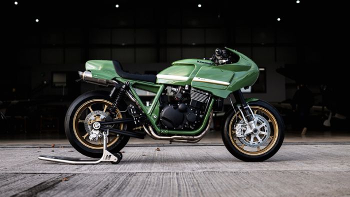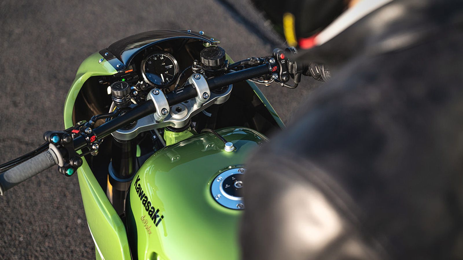 Το fairing έχει φτιαχτεί στο χέρι από μέταλλο, σε μια εργασία που απαίτησε πολλές εργατοώρες και είχε δυσκολίες, όπως χαρακτηριστικά δηλώνει ο Calum. Το κάλυμμα του εμπρός φαναριού είναι ταχείας απελευθέρωσης ενώ η όλη κατασκευή είναι φόρος τιμής στα κλασικά superbikes. Η χαρακτηριστική πράσινη βαφή που επιλέχθηκε, κοσμεί πλέον και το πλαίσιο του μοντέλου, ενώ είναι πιο σκούρα από την «κλασική Kawasaki πράσινη» για ένα πιο… militaire look.