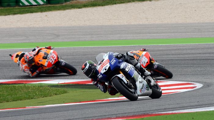 Ο Lorenzo το έχει βάλει σκοπό του να χαλάει τις pole του Marquez, με το να του κλέβει την πρώτη θέση στην εκκίνηση. Έτσι έκανε για μία ακόμη φορά και στο Aragon, στρίβοντας πρώτος, με τα 2 Honda στο κατόπι του. Μετά από 2-3 γύρους, ο αγωνιστικός στίβος αραίωσε, χωριζόμενος στα ακόλουθα «στρατόπεδα». Το πρώτο γκρουπ αποτελούνταν από Lorenzo, Marquez και Pedrosa, με αυτή, αρχικά, τη σειρά. Το δεύτερο γκρουπ απαρτίζονταν από τους Rossi, Bradl, Bautista και Crutchlow. Και πιο πίσω ερχόταν ο έτερος της Yamaha Tech 3, Bradley Smith, παρέα με τα τρία Ducati. Τέλος, ακολουθούσαν ακόμα μακρύτερα οι μοτοσικλέτες CRT, πλην του συνήθη ύποπτου Espargaro, που… έπαιζε σε 2 ταμπλό, ενώ σε κάποια στιγμή πέρασε ακόμα και τους Iannone, και Hayden –για να τον ξαναπεράσουν λίγο αργότερα!