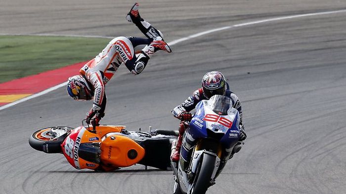 Πολλοί είχαν κατηγορήσει τον Pedrosa πως στους προηγούμενους αγώνες έπαιζε το ρόλο του θεατή. Στο Aragon εκείνος αποφάσισε να πιέσει όμως η τύχη, και ο Marquez, για μία ακόμη φορά δεν ήταν με το μέρος του.