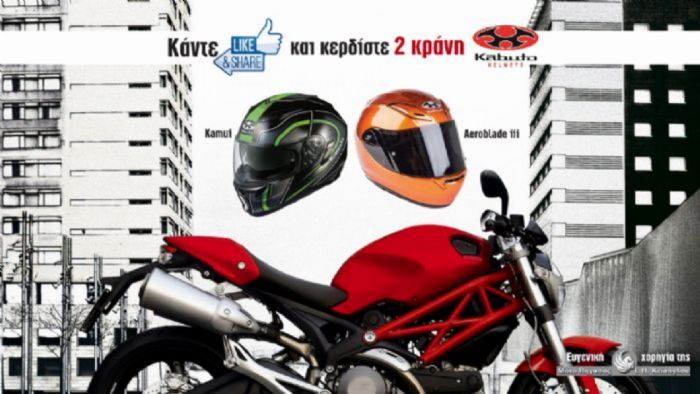 Με την ευγενική χορηγία της Moto Πήγασος, δύο τυχεροί θα κερδίσουν από ένα κράνος υψηλής ποιότητας της ιαπωνικής εταιρείας Kabuto. Συγκεκριμένα, τα μοντέλα που δίνονται ως δώρο είναι τα Kamui και Aeroblade III.