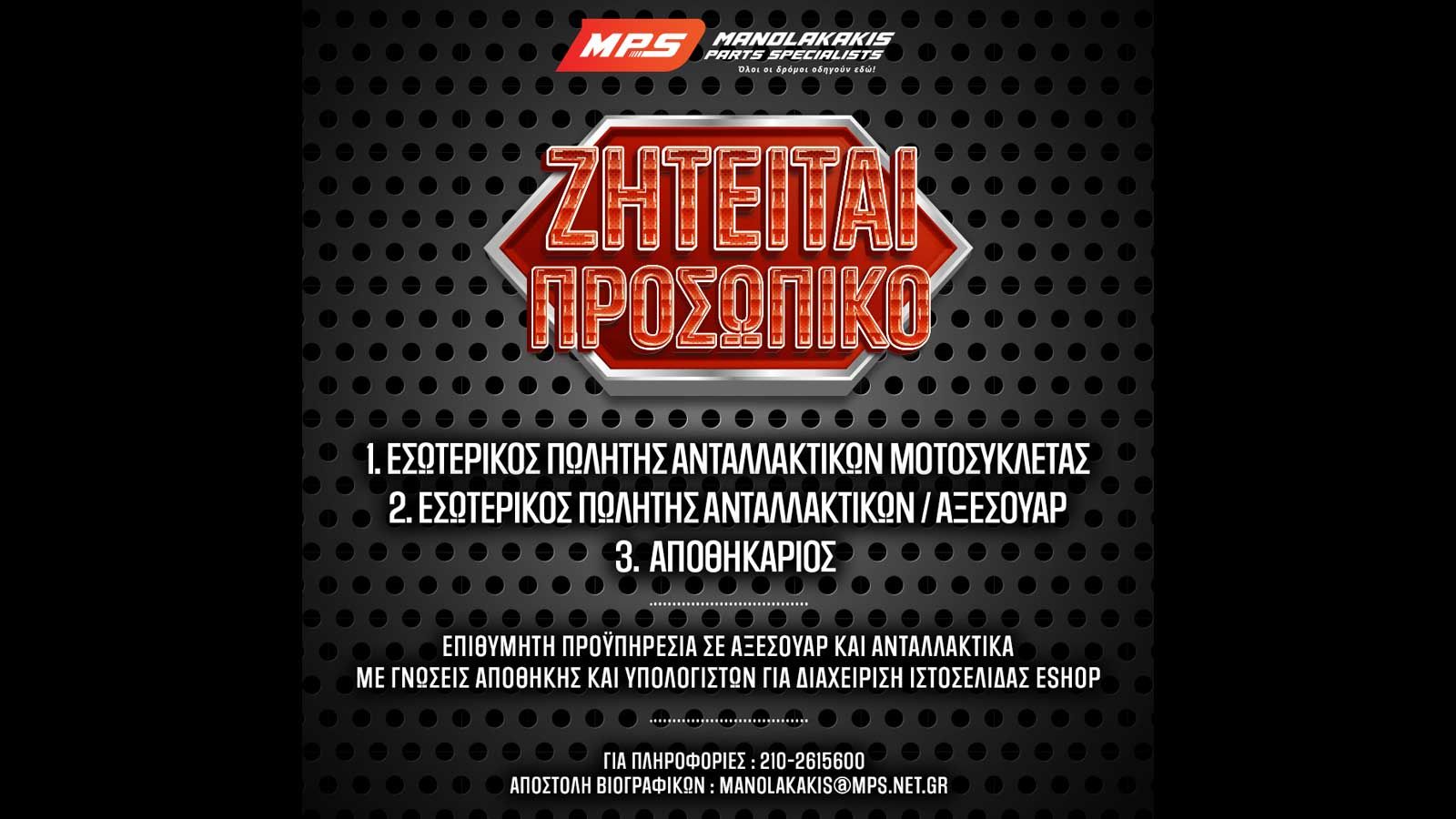 Η MPS Manolakakis αναζητά άτομα για την κάλυψη θέσεων εργασίας. Αν θέλεις να ασχοληθείς με τον χώρο των ανταλλακτικών και των αξεσουάρ μοτοσυκλέτας, τώρα είναι η ευκαιρία σου.