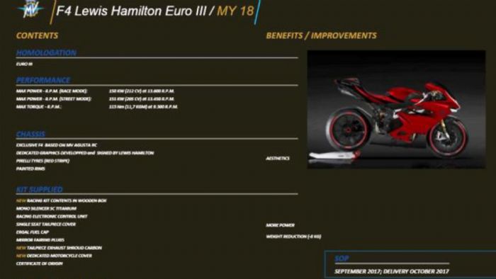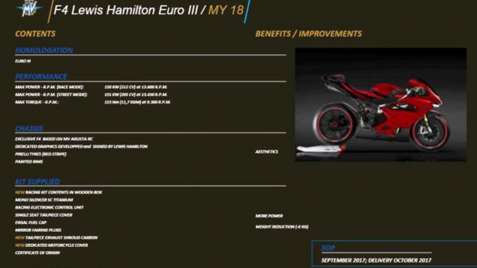 Η νέα MV Agusta F4 RC Lewis Hamilton βασίζεται στη κορυφαία σχεδίαση του 4κύλινδρου κινητήρα της superbike. H εμφάνιση της μοτοσυκλέτας είναι εντυπωσιακή, ενώ τα μηχανολογικά παραμένουν τα ίδια. Το νέο μοντέλο αποδίδει 212 ίππους με 3.6 κιλά λιγότερο βάρος. Σε λίγες ώρες αναμένουμε περισσότερα νέα σχετικά με τη μοτοσυκλέτα.