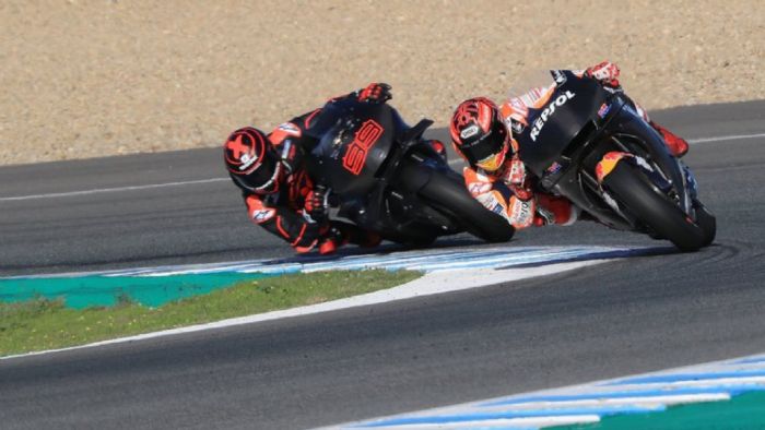 Lorenzo και Marquez σε στιγμιότυπο δράσης, από τις τελευταίες δοκιμές στην Valencia.