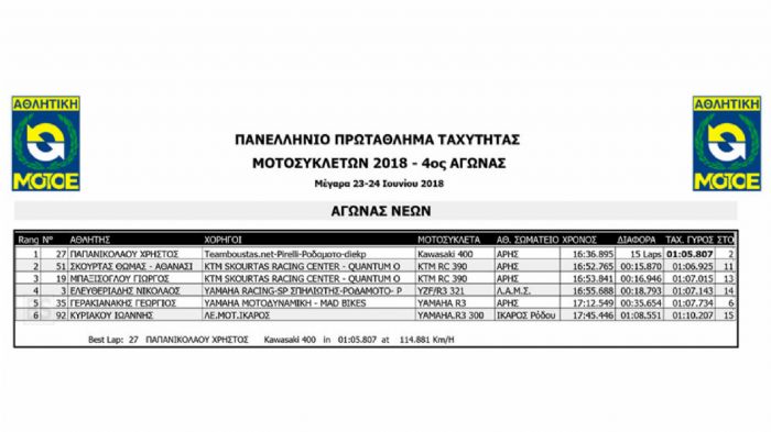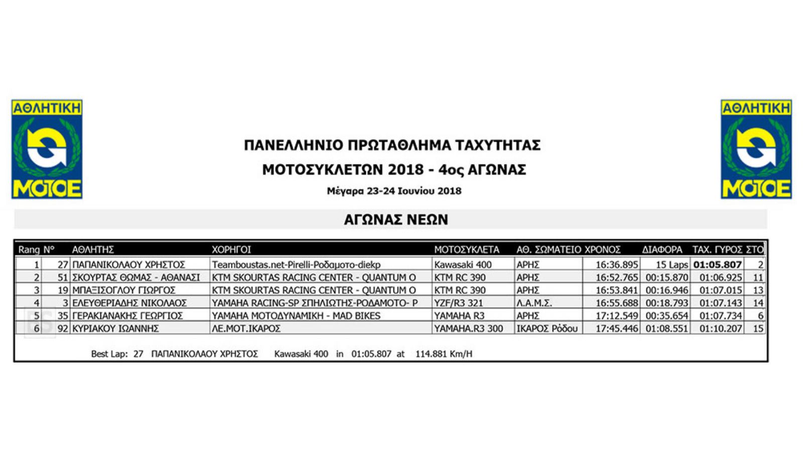 Ο Χρήστος Παπανικολάου πήρε τη νίκη και στην κατηγορία των Νέων με την Kawasaki Ninja 400 του. Έτσι, φεύγει από τα Μέγαρα έχοντας το απόλυτο ρεκόρ με τέσσερις νίκες σε ισάριθμους αγώνες. Αυτό τον φέρνει πιο κοντά στην κατάκτηση του τίτλου και σε αυτή την κατηγορία. Η δεύτερη θέση πήγε στον Θωμά Σκούρτα, ενώ το βάθρο συμπλήρωσε ο Γιώργος Μπαξίσογλου, αμφότεροι με KTM RC 390, οι οποίοι έδωσαν τον δικό τους ξεχωριστό αγώνα.