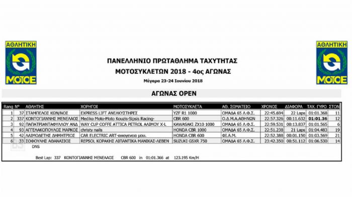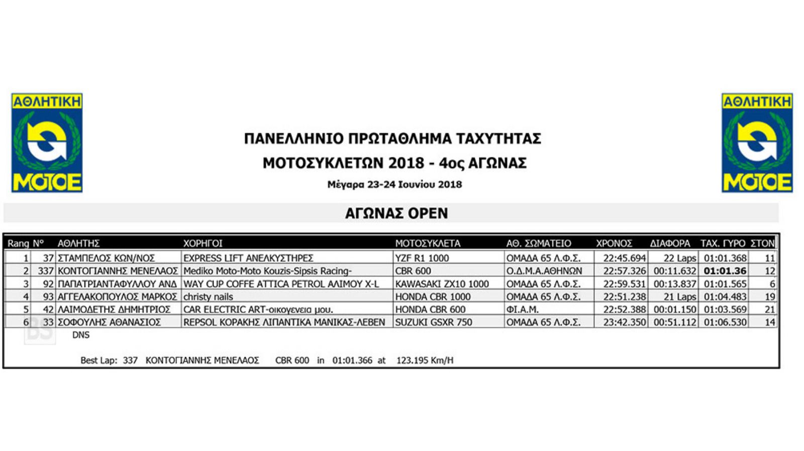 Ο Χρήστος Παπανικολάου παίρνει την τρίτη φετινή του νίκη στην κατηγορία, μεγαλώνοντας έτσι το βαθμολογικό του προβάδισμα και πλέον βρίσκεται μια ανάσα από την κατάκτηση του πρωταθλήματος. Η πιο σημαντική μάχη της κατηγορίας δόθηκε για τη δεύτερη θέση ανάμεσα σε Ανδρέα Παργινό και Γιώργο Κίτσο, με τον πρώτο τελικά να κερδίζει την μεταξύ τους μονομαχία έχοντας μάλιστα διαφορά σχεδόν 3 δευτερολέπτων. Η κατηγορία που φιλοξενεί δίχρονες και τετράχρονες μοτοσυκλέτες συνεχίζει να προσφέρει θέαμα απλόχερα. Open