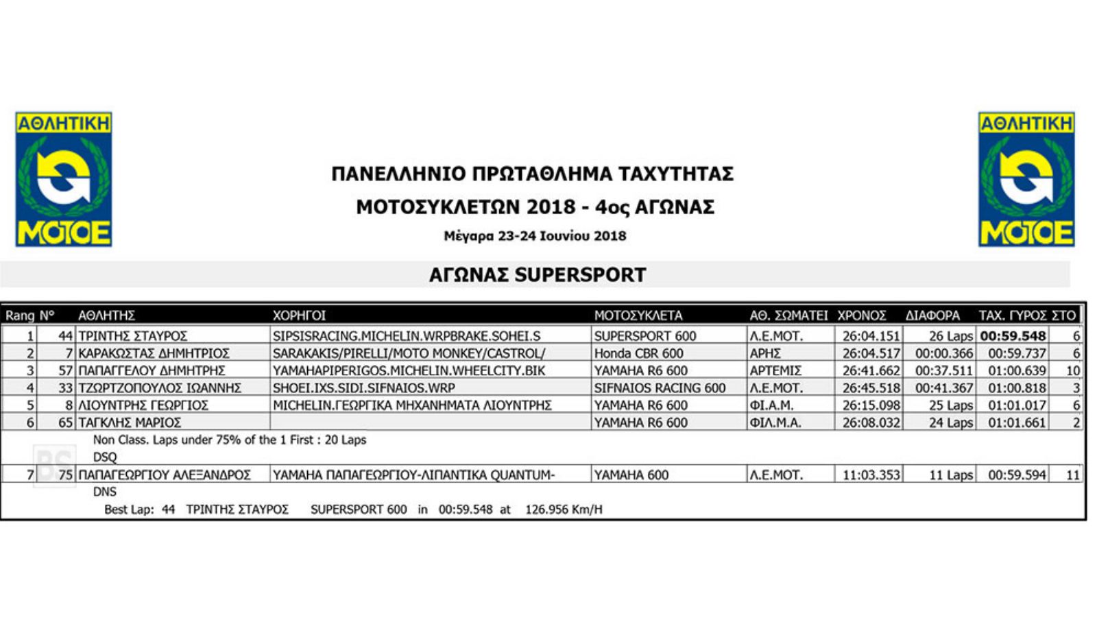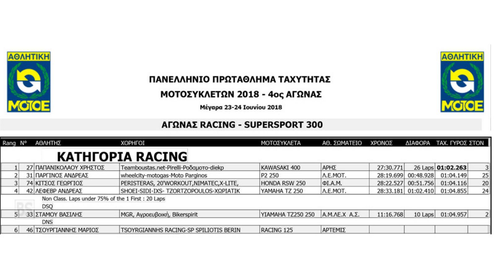 Μάχες σώμα με σώμα είδαμε στην κατηγορία Supersport με τρεις αναβάτες να διεκδικούν την πρώτη θέση του βάθρου. Πρώτος κατάφερε να στρίψει ο Δημήτρης Καρακώστας, μετά από μια πολύ καλή εκκίνηση, με τον Σταύρο Τριντή να ακολουθεί προσεκτικά και να εκμεταλλεύεται τα μικρά λάθη του Καρακώστα, ψαλιδίζοντας σταδιακά τη διαφορά. Τελικά, κατάφερε να περάσει στην πρώτη θέση. Ο Δημήτρης πάλεψε σκληρά για να ανακτήσει και πάλι την πρωτοπορία και έκανε αρκετές επιθέσεις, χωρίς όμως αποτέλεσμα. Ένα από τα highlights του αγώνα ήταν και η εγκατάλειψη του Αλεξ Παπαγεωργίου από μηχανική βλάβη, η οποία μάλιστα προέκυψε ενώ ήταν στην τρίτος. Τελικά, στο τρίτο σκαλί του βάθρου ανέβηκε ο Δημήτρης Παπαγγέλου, ο ποίος μάλιστα λόγω βλάβης στο κιβώτιο ταχυτήτων, οδηγούσε με μια μόνο ταχύτητα στους τελευταίους γύρους. Racing – SSP300