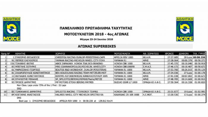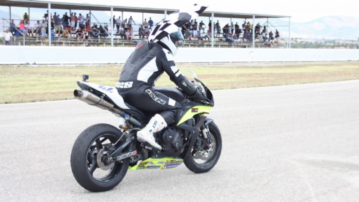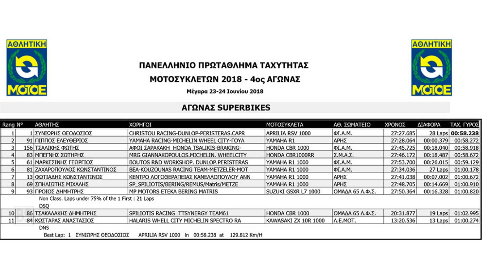 Απολαυστικό θέαμα επεφύλασσε ο αγώνας της μεγάλης κατηγορίας με την πρώτη θέση να αλλάζει συνεχώς χέρια. Πρώτος έστριψε ο Φώτης Τσαλίκης , αλλά δεν κατάφερε να μείνει στην πρωτοπορία, καθώς ο Λευτέρης Πίππος πέρασε μπροστά στο τέλος της ευθείας πριν την Κ6 και άρχισε να απομακρύνεται. Ο Σάκης Συνιώρης κατάφερε και εκείνος να βρεθεί μπροστά από τον Τσαλίκη και μαζί με τον Πίππο παρέδωσαν μαθήματα ευ αγωνίζεσθαι με την καθηλωτική μάχη τους. Τελικά, την καρό σημαία είδε πρώτος ο Συνιώρης με την Aprilia RSV 1000, με τον Πίππο να φέρνει τη Yamaha R1 του στην δεύτερη θέση με διαφορά μόλις 37 εκατοστά του δευτερολέπτου. Τρίτος τερμάτισε ο Τσαλίκης, με το στήσιμό της μοτοσυκλέτας του να μην του επιτρέπει να πάει όσο γρήγορα ήθελε. Supersport