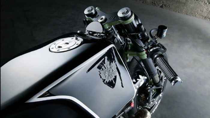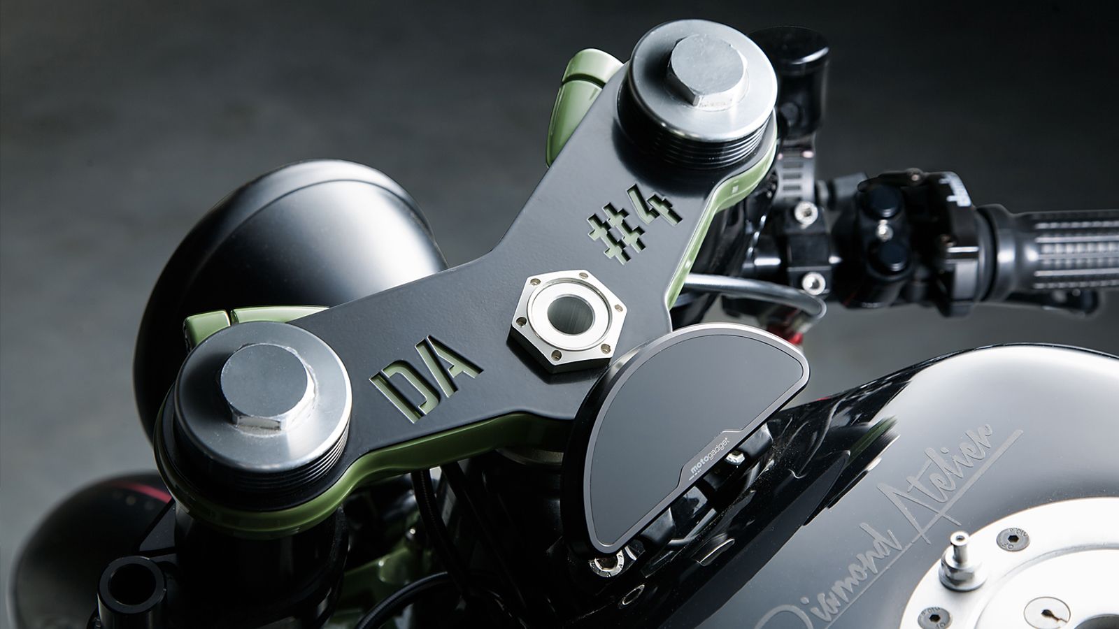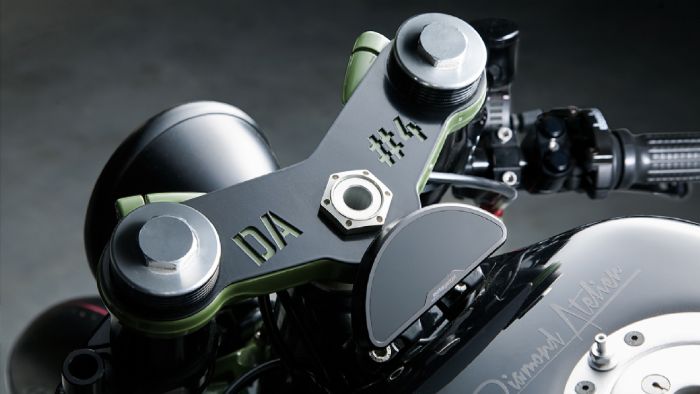 Η μοτοσυκλέτα έχει βαφτεί σε κυπαρρισί και γυαλιστερό μαύρο, ενώ οι λευκές λεπτομέρειες και γραμμώσεις είναι βαμμένες με το χέρι! Εντύπωση προκαλεί και το διαμάντι των 0,17 καρατίων, που έχει τοποθετηθεί στην άνω τιμονόπλακα!
