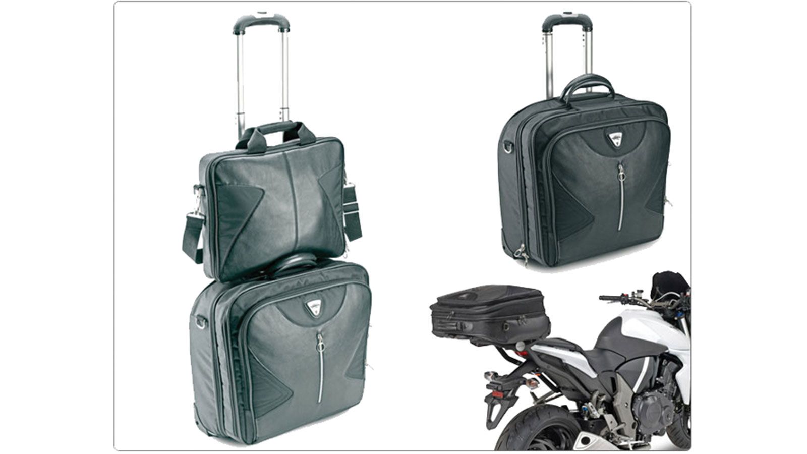 Εύκολη µεταφορά µε ροδάκια, εύκολη προσαρµογή στη µοτοσικλέτα. Ότι ακριβώς ζητά ένας αναβάτης για να µεταφέρει εύκολα και άνετα τα προσωπικά του αντικείµενα.