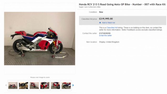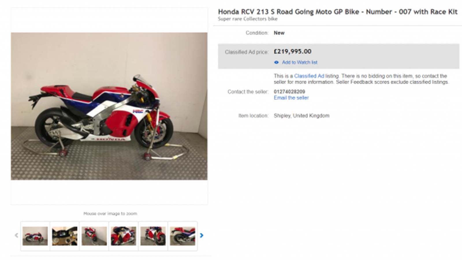 Όπως και να έχει, η μοτοσυκλέτα της αγγελίας δεν έχει κάνει ούτε 1 χιλιόμετρο,είναι εξοπλισμένη με το αγωνιστικό κιτ της HRC που ανέβαζε την ισχύ της στους 215 ίππους, ενώ φέρει τον σειριακό αριθμό 7, όντας μία από τις πρώτες. Μαζί με αυτή, ο πωλητής παρέχει paddock stands εμπρός και πίσω, φορτιστή μπαταρίας, κάλυμμα και δύο κλειδιά keyless ανάφλεξης…