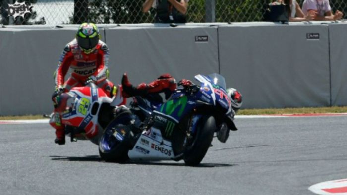 Ο Andrea Iannone χάλασε την ημέρα του Jorge Lorenzo, αλλά και την δική του, στον χθεσινό αγώνα της Βαρκελώνης στα Moto GP. O Ιταλός υπερέβαλλε εαυτόν και συγκρούστηκε στα φρένα με τον Jorge Lorenzo, οδηγώντας στην εγκατάλειψη και των δύο, πραγματοποιώντας το ίδιο λάθος που έκανε στην Αργεντινή.