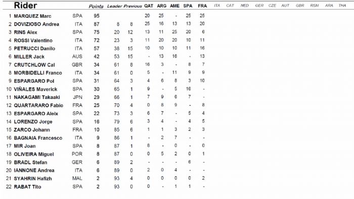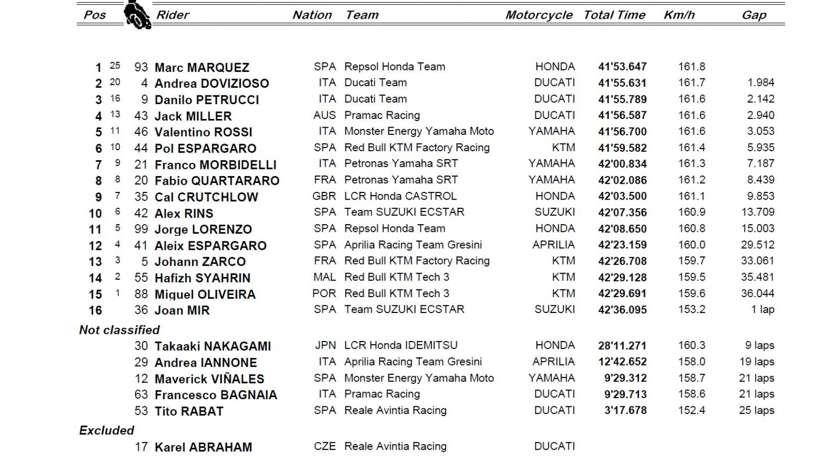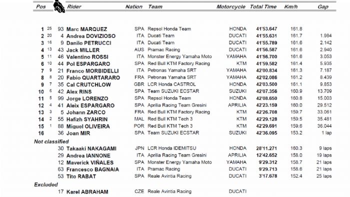 Εγκατέλειψαν οι Abraham (μαύρη σημαία), Bagnaia – Vinales (πτώση), Iannone (τεχνικό) και Nakagami (πτώση).