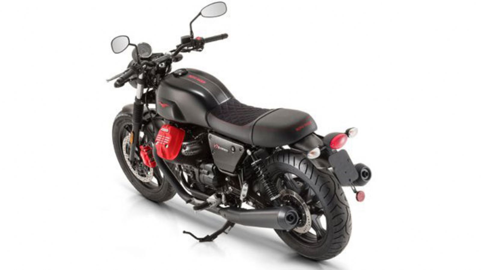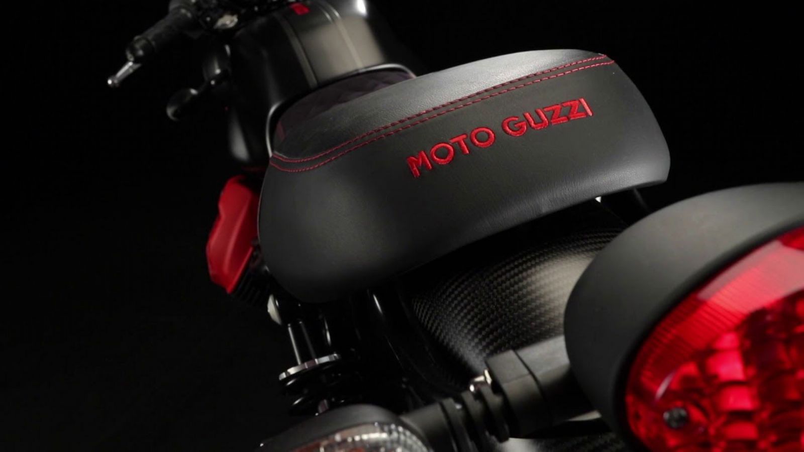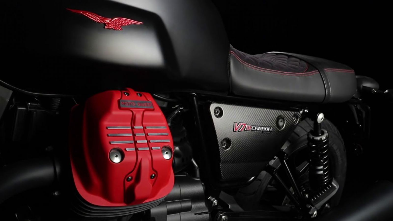 Το χρώμα που έχει επιλεγεί για την Carbon είναι το μαύρο ματ το οποίο συνδυάζεται με κόκκινες λεπτομέρειες, όπως τη δαγκάνα του εμπρός φρένου της Brembo, τα λογότυπα στα πλαϊνά καπάκια, το σήμα του αετού στο ρεζερβουάρ και φυσικά τις κεφαλές του δικύλινδρου κινητήρα των 744 κυβικών. Αποκλειστικά για τη συγκεκριμένη έκδοση, η σέλα έχει επενδυθεί με αδιάβροχη Alcantara, που είναι ιδιαίτερα ανθεκτική στις καιρικές συνθήκες, ενώ οι ραφές της είναι κόκκινες. Φυσικά, από ένα τόσο ξεχωριστό μοντέλο δεν θα μπορούσαν να λείπουν και οι ξεχωριστές λεπτομέρειες. Για το λόγο αυτό η Moto Guzzi επέλεξε την εφοδιάσει με τάπα ρεζερβουάρ από μαύρο αλουμίνιο, ενώ από το ίδιο υλικό είναι κατασκευασμένα τα καλύμματα της εισαγωγής, το πλαίσιο του προβολέα και το προστατευτικό της αντλίας του πίσω φρένου.