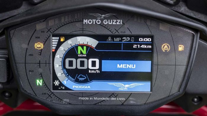 Προσέξτε επίσης την επιγραφή «Made in Mandello del Lario» που βρίσκεται στο κάτω μέρος της οθόνης και τονίζει την ταυτότητα του μοντέλου, όπως και ο αετός επάνω ακριβώς από την TFT…