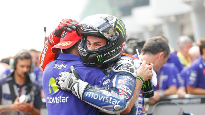 Έχοντα τερματίσει μπροστά από τον Rossi και μη γνωρίζοντας τι έχει γίνει, ο Lorenzo πετάει στα σύννεφα.