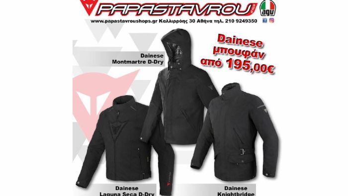 Τα χειμερινά μπουφάν της Dainese μπορείτε να τα βρείτε στα καταστήματα Papastavrou, σε τιμές που ξεκινούν από τα 195 ευρώ! Για περισσότερες πληροφορίες, επισκεφθείτε την ιστοσελίδα του καταστήματος, κάνοντας κλικ εδώ!