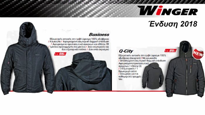 Για όσους θέλουν κάτι ακόμη πιο προσιτό, η Winger παρουσιάζει και το μπουφάν Q-City. Με έντονες καθημερινές γραμμές, το Q-City απευθύνεται στον αναβάτη που κινείται συνεχώς με δίκυκλο και επιζητά άνεση, προστασία αλλά και στυλ. Το μπουφάν είναι φτιαγμένο από 100% αδιάβροχο, ανθεκτικό στην τριβή ύφασμα neoprene και είναι εξοπλισμένο με προστασίες που αφαιρούνται, σε αγκώνες και πλάτη για μέγιστη ασφάλεια. Η εσωτερική θερμική επένδυση που αφαιρείται εξασφαλίζει άνεση ακόμα και σε πολύ χαμηλές θερμοκρασίες, κάνοντας την καθημερινή χρήση εύκολη, ενώ οι 3 εξωτερικές και η μία εσωτερική τσέπη προσθέτουν σε πρακτικότητα. Το Q-City μπορεί να γίνει δικό σας στην τιμή των 85 ευρώ μόνο.