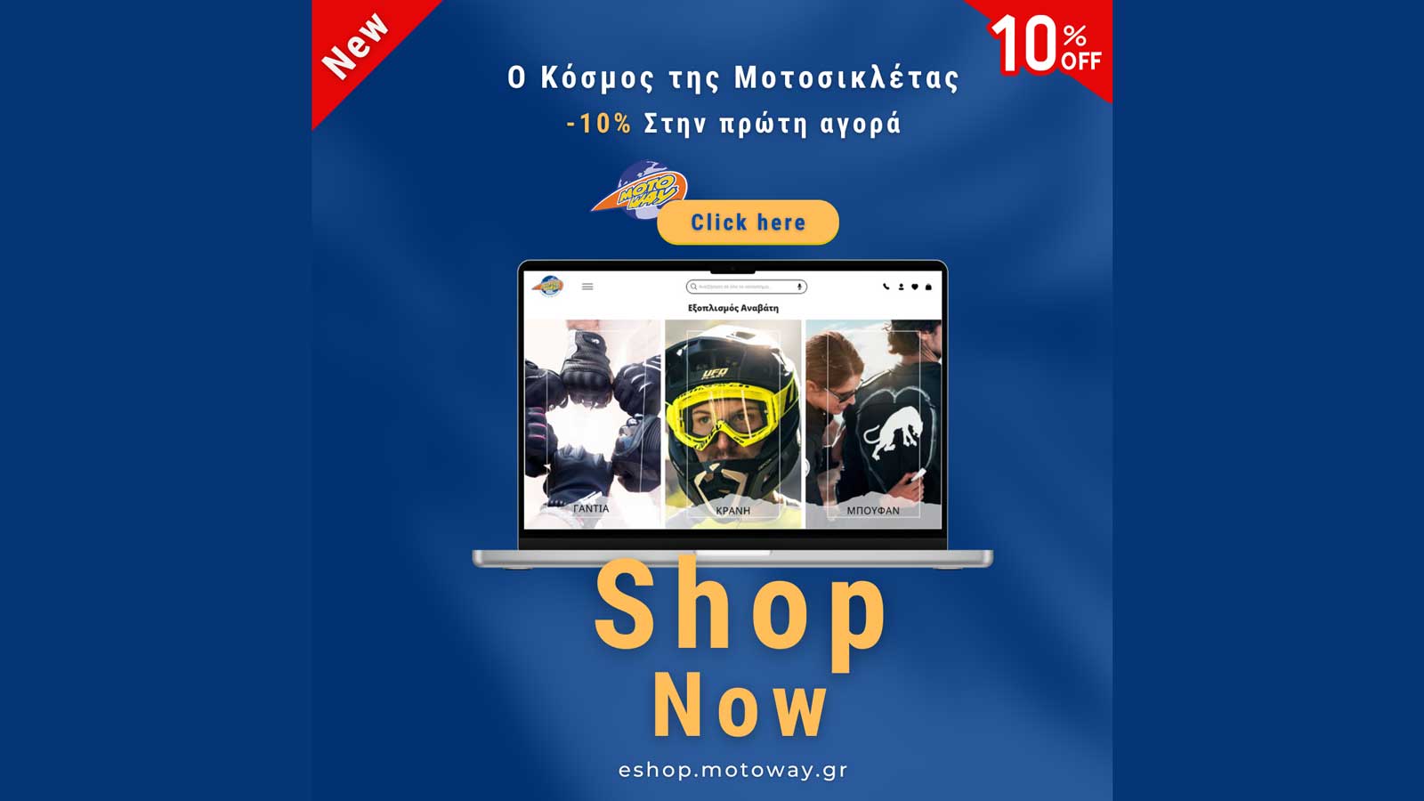 Η αλήθεια είναι ότι το να διαλέγεις και να αγοράζεις ό,τι θέλεις από την άνεση του σπιτιού σου αποτελεί μια μεγάλη διευκόλυνση στην καθημερινότητα και η Motoway, όντας μια εταιρεία που αντιλαμβάνεται τον παλμό της σημερινής εποχής, προχώρησε στην εγκαθίδρυση ενός σύγχρονου E-Shop, όπου η τεράστια γκάμα εταιρειών που διαθέτει στο κομμάτι του εξοπλισμού αναβάτη και μοτοσυκλέτας είναι διαθέσιμη προς αγορά από τους αναβάτες. Ο σχεδιασμός του είναι επικεντρωμένος στο να κάνει την εμπειρία πλοήγησης και αγορών απλή και ευχάριστη για τον χρήστη, με όλα τα προϊόντα να είναι εντεταγμένα σε αντίστοιχες κατηγορίες ώστε πάντα να βρίσκεις αυτό που θες.