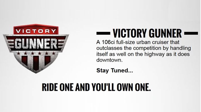 Το Gunner αναμένεται να παρουσιαστεί στις 8 Φεβρουαρίου και η Victory έχει φροντίσει ώστε να μη διαρρεύσει καμιά πληροφορία για αυτό. Το μόνο που γνωρίζουμε είναι ότι θα διαθέτει v-twin κινητήρα 1.737 κ.εκ. και ότι πιθανότατα θα ακολουθήσει τις μοντέρνες σχεδιαστικές γραμμές που έχουμε δει στα πρόσφατα μοντέλα της Victory.