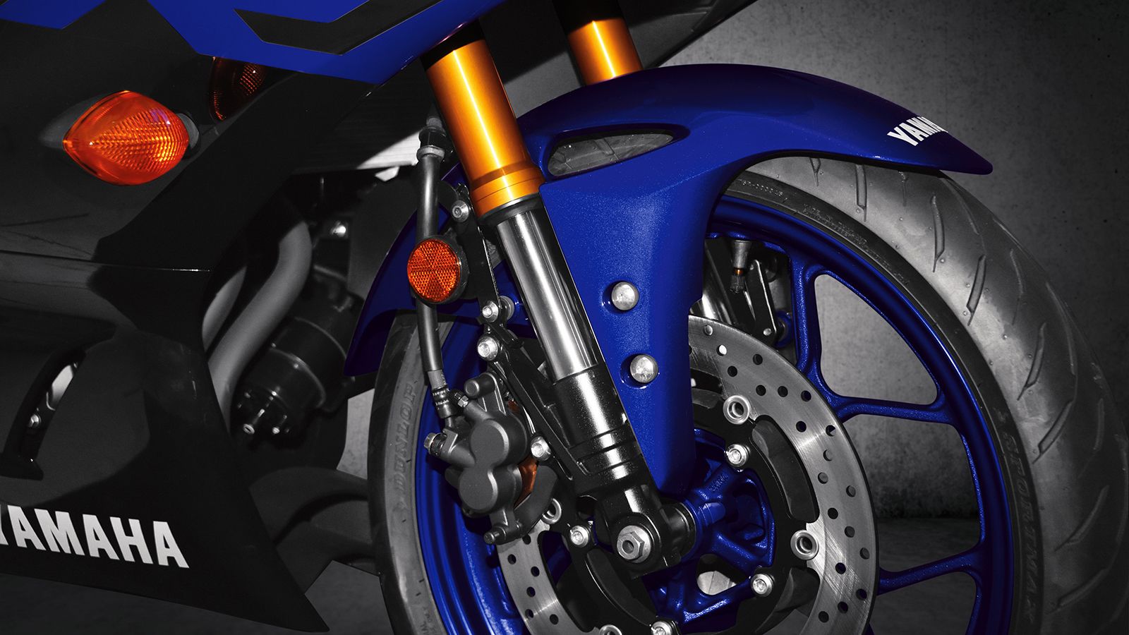 Ολοκαίνουργιο είναι το εμπρός ανεστραμμένο πιρούνι 37 χιλιοστών, από την Kayaba, τα οποία σχεδιάστηκαν με αυξημένη επιφάνεια επαφής μεταξύ μπότας και καλαμιού. Αυτό, σύμφωνα με την Yamaha, υπόσχεται μεγαλύτερη ακαμψία και πιο στιβαρή αίσθηση στον αναβάτη που αναζητά την σπορ οδήγηση. Νέες είναι επίσης οι τιμονόπλακες, από τις οποίες η άνω είναι φτιαγμένη από αλουμίνιο σε σχέδιο που θυμίζει R1.