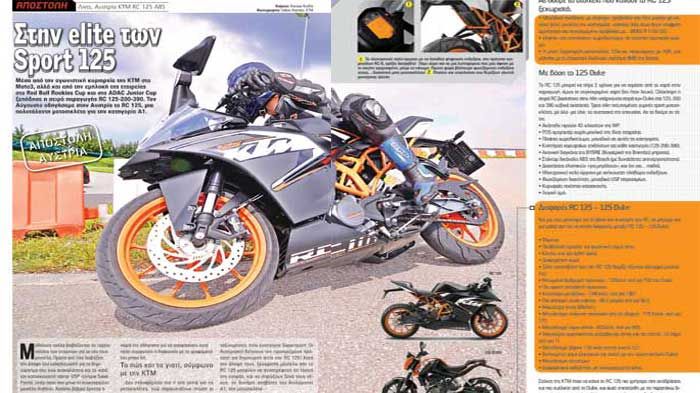 Στο νέο τεύχος του Moto Τρίτη ταξιδεύουμε μέχρι την Αυστρία και ανακαλύπτουμε-οδηγούμε τη νέα μικρή sport KTM RC 125, την πρώτη και μοναδική μέχρι στιγμής μοτοσικλέτα της κατηγορίας που φέρει στον εξοπλισμό της και ABS, και φυσικά το αγωνιστικό DNA της αυστριακής εταιρίας!