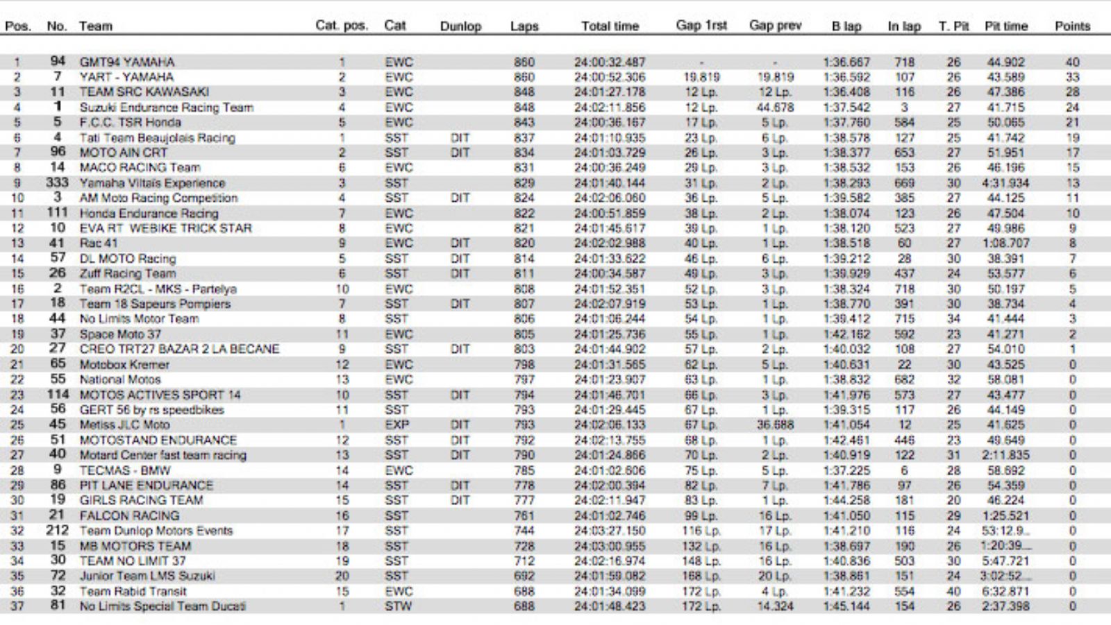 Η ομάδα της YART ήταν πρώτη στο μεγαλύτερο μέρος του αγώνα, αλλά τρεις ώρες πριν το τέλος το προβάδισμα πήρε η ομάδα της GMT 94 και ο πρώην αναβάτης Moto Gp Mike Di Meglio κατάφερε να πάρει την πρώτη του νίκη σε 24ωρο αγώνα.