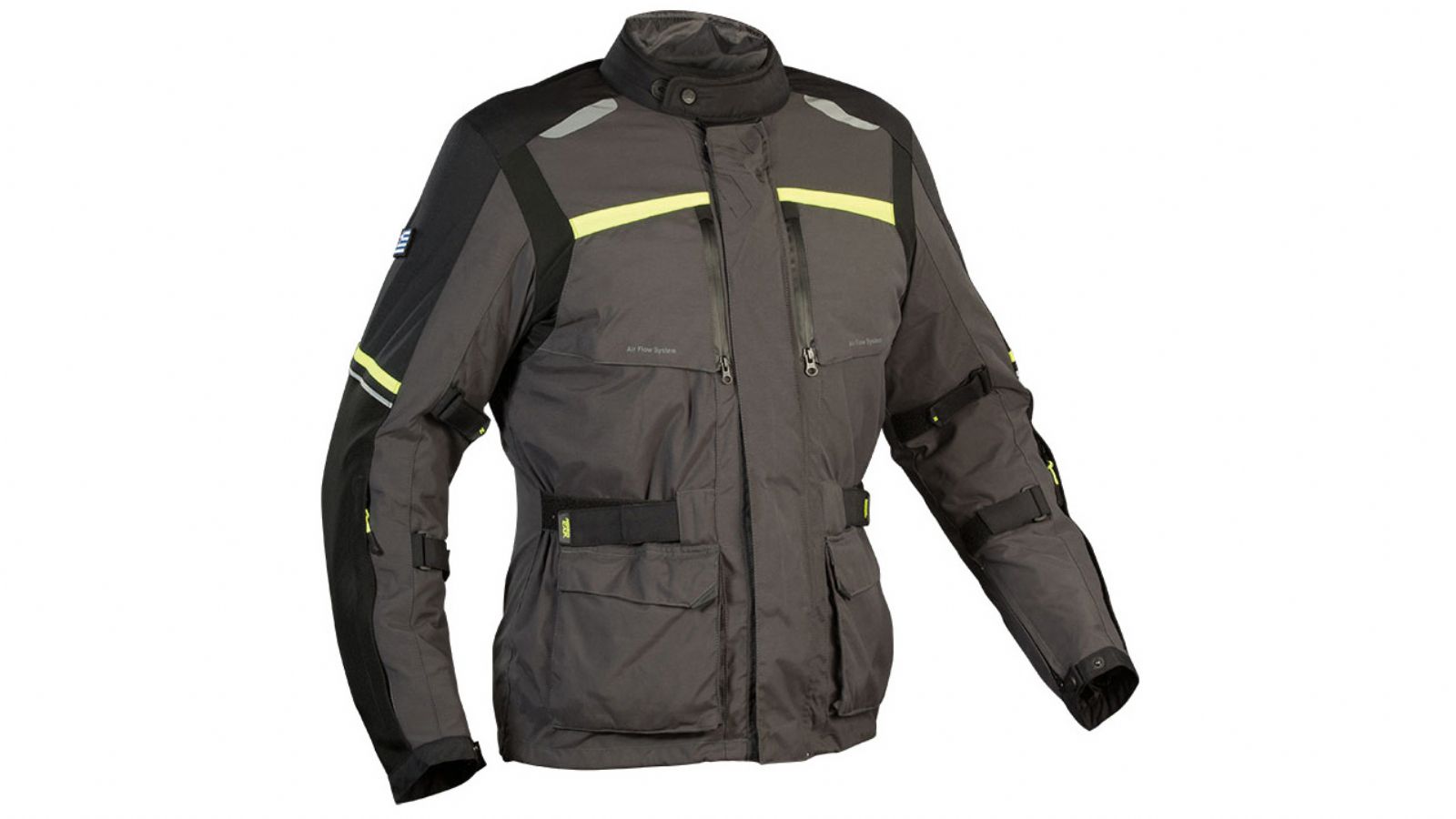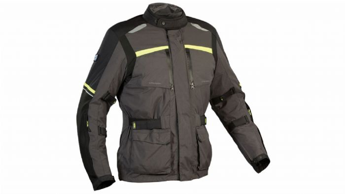 Είναι κατασκευασµένο από ύφασµα υψηλής αντοχής και φέρει προστατευτικά σε ώµους, αγκώνες και πλάτη. Διαθέτει 2 αδιάβροχες, εξωτερικές τσέπες µπροστά, µεγάλη τσέπη πίσω, εσωτερική αδιάβροχη τσέπη εγγράφων και τσέπη για κινητό τηλέφωνο.