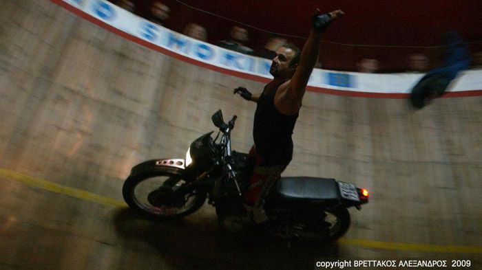 Ο Βαγγέλης Ανδρέου είναι ίσως ο μοναδικός εν ενεργεία στο είδος του στην Ελλάδα που δίνει αυτή την ριψοκίνδυνη παράσταση. Επικίνδυνες αποστολές με δεμένα μάτια, διπλοκάβαλο κυνηγητό μεταξύ τους και ίσως και το περίφημο salto mortale. Όσοι ως παιδιά έχουμε δει «το γύρο του θανάτου», δεν μπορούμε να ξεχάσουμε τον ήχο της μοτοσικλέτας στα ξύλινα τοιχώματα, τον ακροβάτη-αναβάτη να φτάνει σε απόσταση αναπνοής από τους θεατές, τον εκκωφαντικό θόρυβο και τα φώτα της μηχανής να περιστρέφονται στο σκοτάδι του βαρελιού.