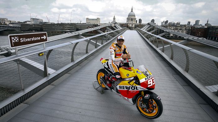 Ο Ισπανός ποζάρει με την RC213V του, στη γέφυρα. Προσέξτε την πινακίδα "προς Silverstone".