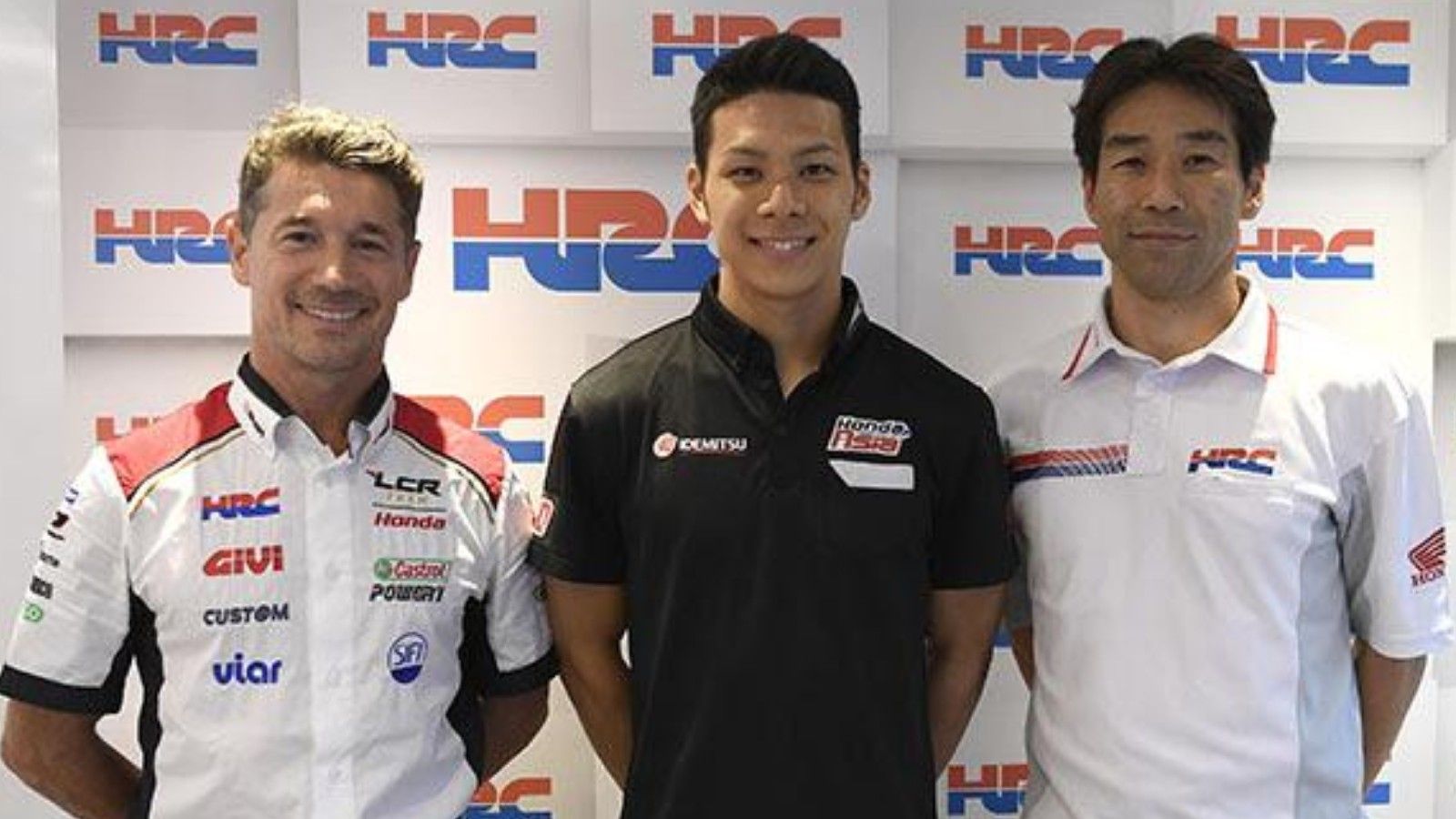 Ο Takaaki Nakagami ανάμεσα στον Lucio Ceccinello (αριστερά) και τον διευθυντή της HRC, Tetsuhiro Kuwata.