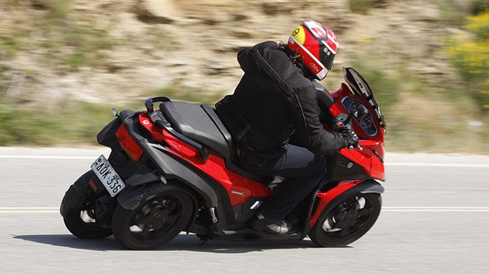 Η θέση οδήγησης φέρνει το σώμα σε μια εργονομικά άνετη στάση, μέση και γόνατα σε απολύτως ορθή γωνία, εξαιρετική στήριξη στη μέση. Το πλάτος της σέλας στο μπροστινό της μέρος παραμένει αρκετά φαρδύ ώστε να δυσκολεύει λίγο την πρόσβαση των ποδιών προς το έδαφος. Το ύψος της σέλας δεν προϊδεάζει για αυτή τη δυσκολία, η οποία είναι καθαρά αποτέλεσμα του πλάτους του Quadro. Το τιμόνι και όλα τα χειριστήρια έρχονται άνετα στα χέρια και συνεισφέρουν σε μια ουδέτερη θέση οδήγησης. Άριστη η ζελατίνα, κρατά σώμα και κεφάλι έξω από τη ροή του αέρα. Η σέλα είναι εξαιρετικά άνετη για αμφότερους τους επιβαίνοντες ακόμη και για πολύωρη οδήγηση. Στην πόλη είναι πραγματικά εντυπωσιακός ο τρόπος με τον οποίο σιδερώνει τις ανωμαλίες του οδοστρώματος. Ο αναβάτης θα νιώσει μόνο τις μεγάλες λακούβες, αυτές που είναι ικανές να χωρέσουν έναν τροχό 14 ιντσών, όλα τα υπόλοιπα απλώς τα καταπίνουν τα τέσσερα αμορτισέρ του. Το ίδιο συμβαίνει και υπό κλίση, οποιαδήποτε κλίση. Περνάς σαμαράκι ξαπλωμένος και το θηρίο δεν κουνάει καν από τη γραμμή του, απλά ισιώνει την ανωμαλία και συνεχίζει απτόητο.