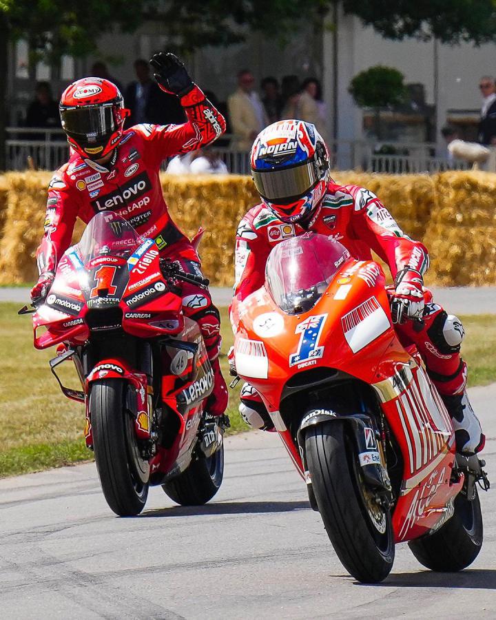 Οι 2 Παγκόσμιοι Πρωταθλητές της Ducati, Casey Stoner και Francesco Bagnaia, οι 2 Desmosedici με το #1, αυτή του 2008 και αυτή του 2023, δίπλα δίπλα στην πίστα του Goodwood.