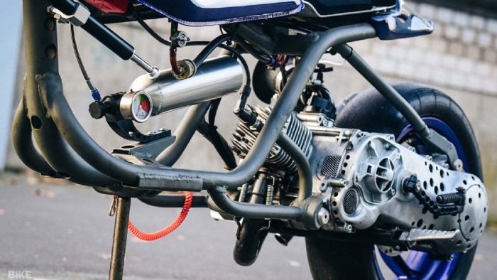 Ο κινητήρας αποτελεί ένα χαρακτηριστικό παράδειγμα «φτιαγμένου» 50αριού. Φέρει ένα κιτ 70 κυβικών της Polini, με χειροποίητες εξατμίσεις και νέο συμπλέκτη Malossi Delta. Παράλληλα, ένα καρμπυρατέρ FCR της Keihin στα 28 χιλιοστά τοποθετήθηκε στο μοντέλο, μαζί με ένα σύστημα NOS κατευθείαν από την Florida. Με… αυτά και με εκείνα, το scooter μπορεί να αποδώσει 20 ίππους (από 50 κυβικά!), ενώ ζυγίζει μόνο 56 κιλά. Τέλος, το φινίρισμα της δημιουργίας ανέλαβε ο Von Maze, καλλιτέχνης ο οποίος το κόσμησε με χειροποίητα γραφικά. Τρελό; Σίγουρα. Ενδιαφέρον; Σιγουρότατα!