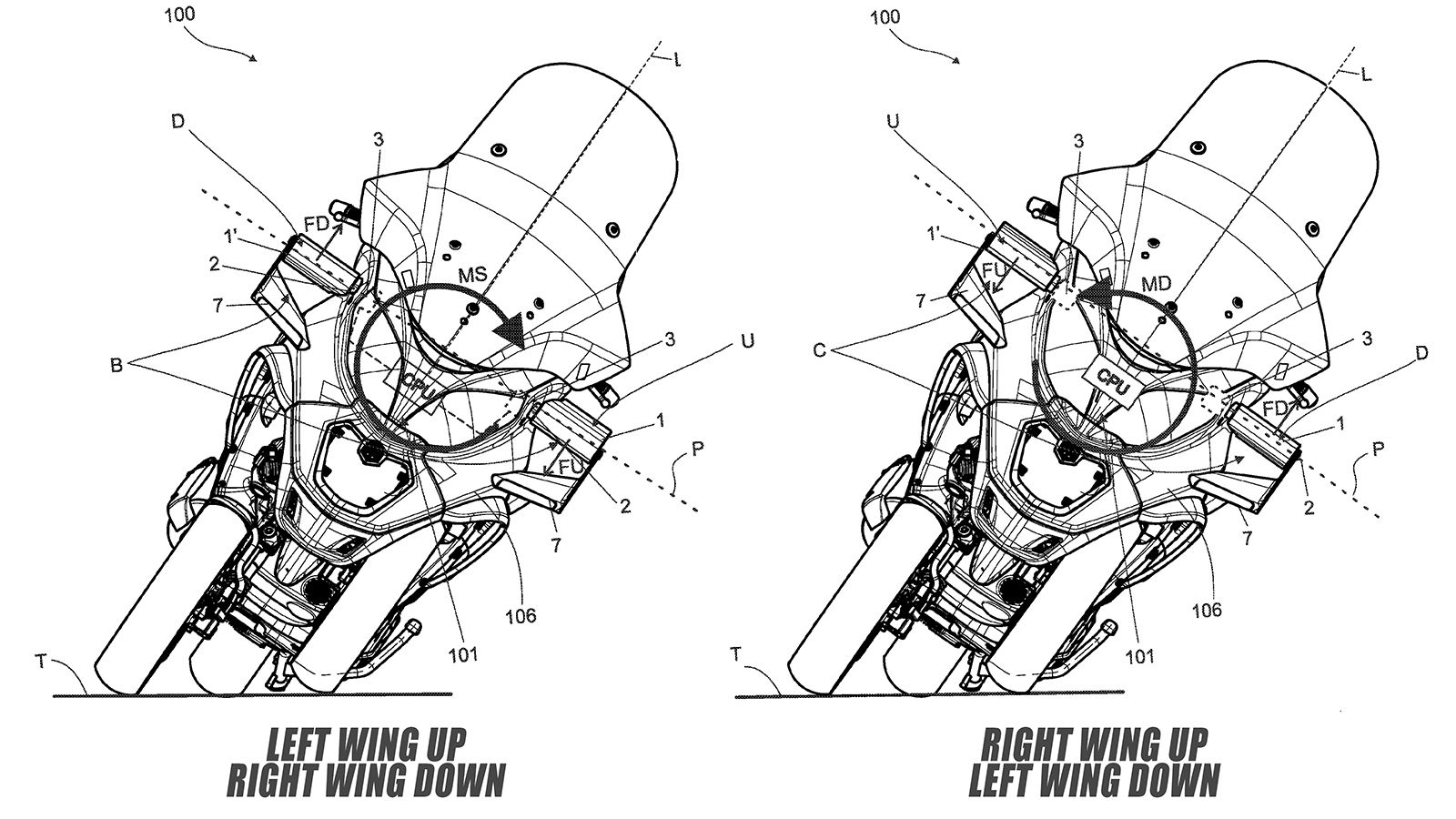 Δείτε τα σχέδια, τα οποία είναι ιδιαίτερα επεξηγηματικά. Τα πτερύγια διακρίνονται εκατέρωθεν του fairing του MP3, στο εμπρός μέρος και σχετικά ψηλά, δίπλα από τα φωτιστικά σώματα. Τα πτερύγια ελέγχονται από ηλεκτρονικό εγκέφαλο και σεβομηχανισμό, αλλάζοντας την γωνία προσβολής τους με τον αέρα ανάλογα με τις οδηγικές συνθήκες. Αυτό φυσικά σημαίνει ότι η επίδραση τους μπορεί να μεταβάλλεται σε πραγματικό χρόνο.