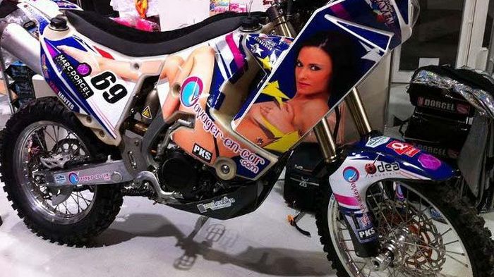 Ο Hugo Payen είχε τρέξει και στο Dakar του 2013 με τον ίδιο χορηγό (Marc Dorcel), με τη μοτοσικλέτα του διακοσμημένη με την εικόνα της Ρωσίδας πορνοστάρ Anna Polina. Και φέτος, η Anna Polina πόζαρε για μία ακόμη φορά με τον Payen και τη μοτοσικλέτα του, η οποία είναι σαφώς πιο καλαίσθητα βαμμένη από πέρυσι.