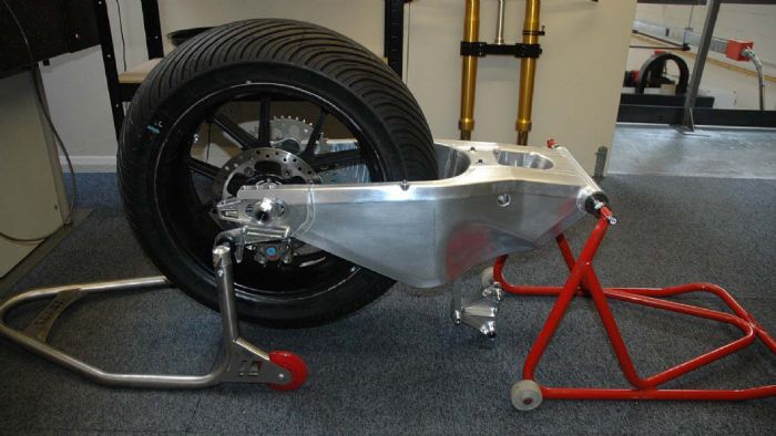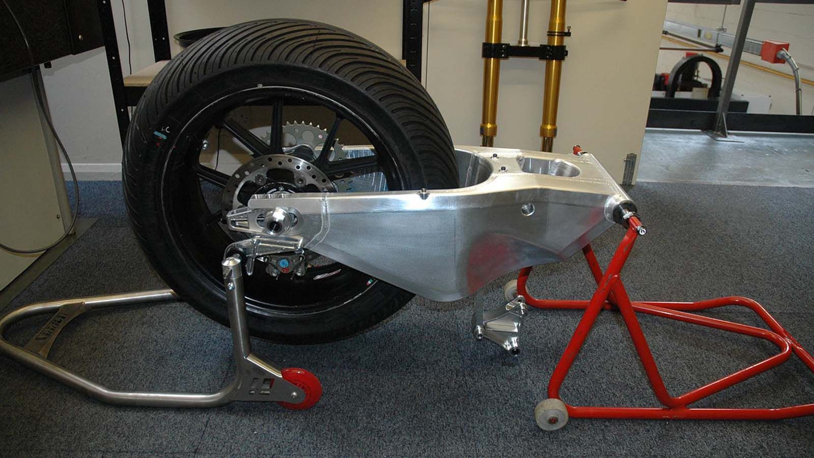 Ένα ψαλίδι αγωνιστικής μοτοσυκλέτας. Η απίστευτα ισχυρή κατασκευή του είναι προφανής ακόμη και στην φωτογραφία.