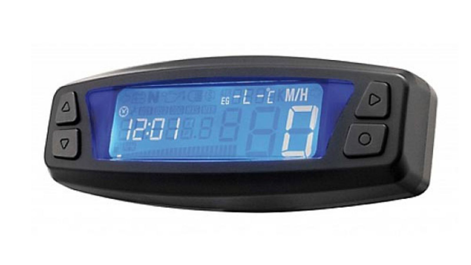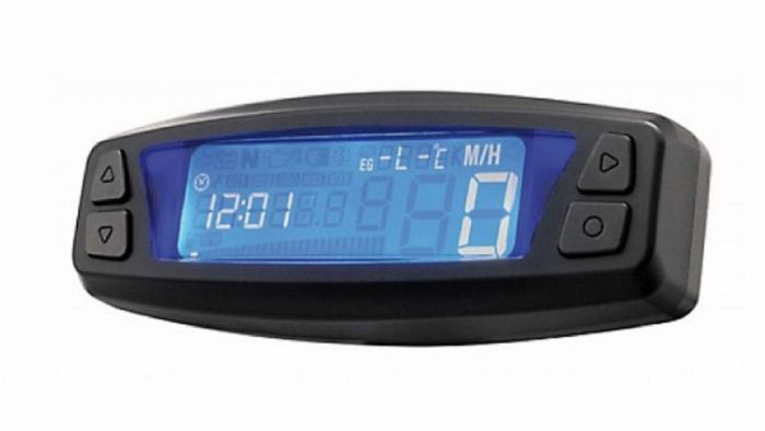 Είναι φωτιζόμενο με βάση που προσαρμόζεται σε όλα τα στρογγυλά τιμόνια ανεξάρτητα από τη διάμετρό τους. Χαρακτηριστικά: Ταχύμετρο KM/H (0-399KM/H), στροφόμετρο 0-20,000rpm, οδόμετρο, διπλό οδόμετρο ταξιδίου, ρολόι, ειδοποίηση χαμηλής τάσης μπαταρίας, ρύθμιση ανώτερης ταχύτητας, ρύθμιση ανώτερων στροφών, θερμοκρασία εξωτερική και κινητήρα, ένδειξη βενζίνης, ένδειξη αλλαγής λαδιού, ενδείξεις (φλάς, μικρή – μεγάλη σκάλα, νεκρά, πίεση λαδιού). Είναι αδιάβροχο. Διαστάσεις: 120mm (Μήκος) x 43mm (Πλάτος) x 28,50mm (Ύψος).