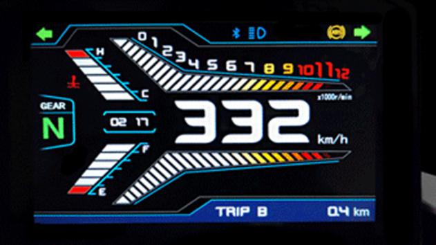 Οι εσοχές που δημιουργούνται από τα αεροδυναμικά προστατευτικά του ρεζερβουάρ καλύπτουν τα πόδια του αναβάτη και οι γωνίες που δημιουργούνται είναι εργονομικά μελετημένες για άνετη οδήγηση. Την επιθετική εμφάνιση συμπληρώνει ο LED προβολέας με τη βάση για τη ψηφιακή TFTοθόνη να παίζει το ρόλο μιας μικρής αεροδυναμικής μάσκας.