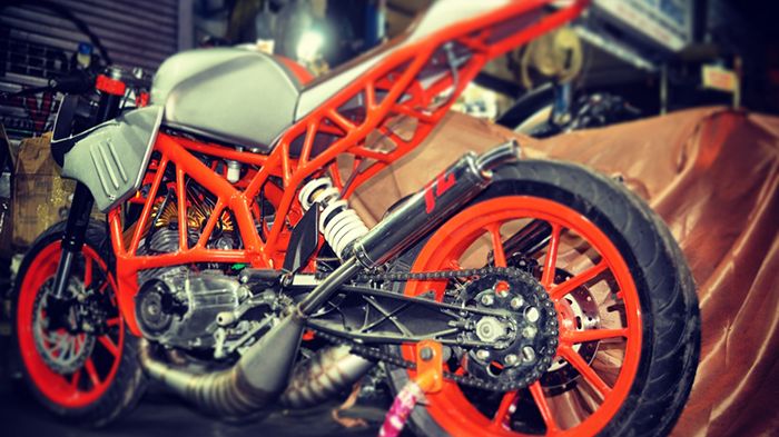 Λίγο αργότερα, με την οικονομική στήριξη των δικών του είχε βρεθεί με τα συστατικά για να φτιάξει τη μοτοσικλέτα που είχε ονειρευτεί με τους δύο κολλητούς του. Το δικό του ΚΤΜ 390 Duke κι έναν ταλαίπωρο, μεταχειρισμένο κινητήρα από ένα παλιό αμερικάνικων προδιαγραφών Yamaha RD350. Προφανώς το σχέδιο ήταν να παντρέψει τα δύο, στο project που αρχικά ονομάστηκε Inline 3.